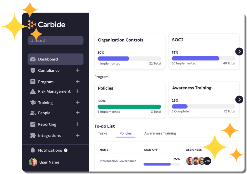 With the backend work we did, our team was able to bring many new requested frameworks and regulations to the Carbide platform. In fact, we brought over 10 new frameworks, including our very own Carbide Best Practices. This new framework provides security recommendations for any company, regardless of their chosen certifications. It also provides companies with actionable tasks to continue improving their security and privacy after achieving their first attestation. And as a way of supporting our customers on their security and privacy journeys, we’ve enabled Carbide Best Practices for every account at no additional cost.