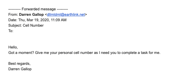 Phishing is getting harder to spot. Although many people feel confident in recognizing a phishing email, 2019 saw a rise in highly personalized and targeted phishing attacks. Some of these fooled even the most astute recipients because they’re so well put together and personalized. Check out this email sent to a Carbide employee, claiming to be from our CEO asking them to complete a quick task. This would lead to social engineering by text or phone to get even more information or access.